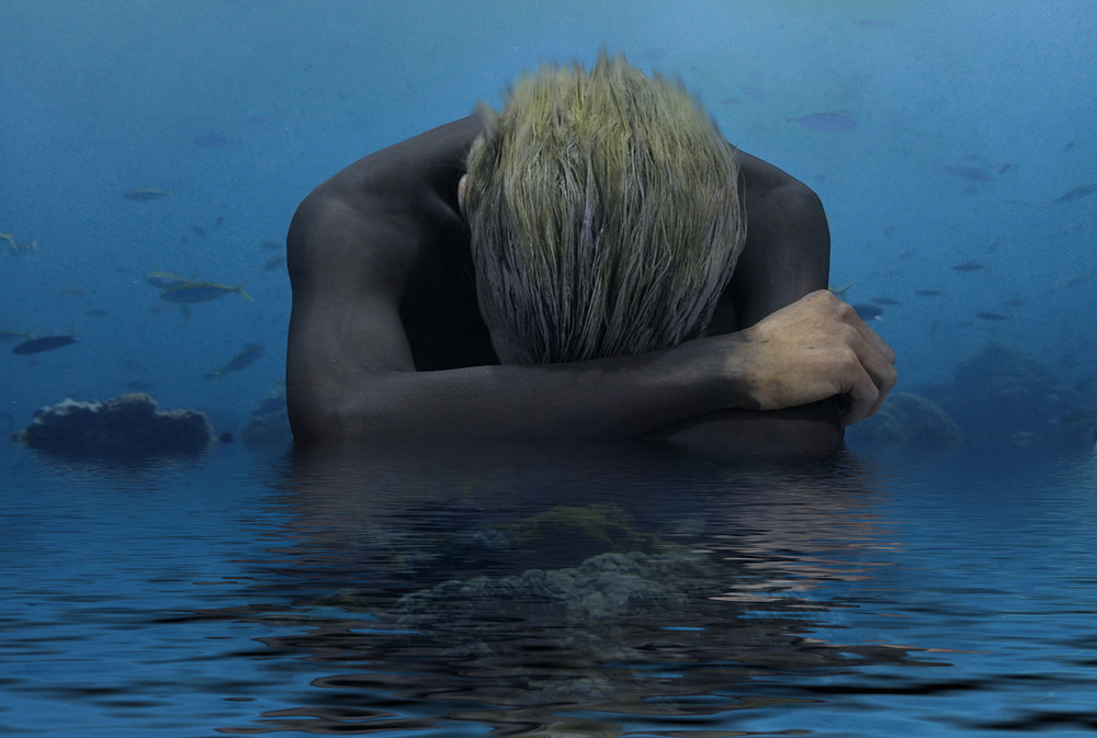 This image is to show the demise of our oceans. The girl crying into the ocean and at the same time the corals being reflected as part of her own reflection, thus bringing the interlinked existence between humans and the ocean into play. She is painted black, at first glance suggesting a wet suit, but then perhaps opening the viewer up to wondering why paint ... suggesting rather the oil/pollution that is in the ocean covering all creatures to a greater or lesser extend.