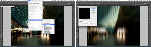 1) In Photoshop, I decided to first apply the Motion Blur filter (Filter > Blur > Motion Blur). It allowed me to hide the uninteresting parts of the image and to highlight the strengths of the image — the central gridded structure and the figures on the left and right sides of the frame. The central structure was the main feature, and the people were secondary. So I decided that the blur should start from the bottom-left of the frame, leaving just enough shape in the shadows to give an impression of the human figures there. I wanted to make sure that the group of people in the center was highlighted a bit, but I was most interested in leading the viewer's eye to the figure holding the bag and to the isolated person on the right. I made a copy of the background layer and applied the Motion Blur filter with Angle set to 90 degrees and Distance set to 350 pixels.